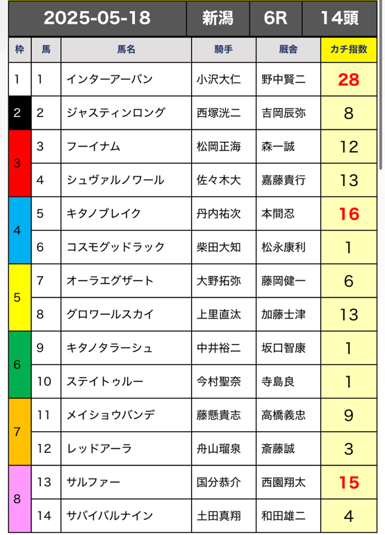ここの口コミでも無料予想の赤文字ガチ指数で馬連と馬単を3頭ボックスで買う方法で5月18日の日曜日新潟6Rで相当な配当を獲得できました。